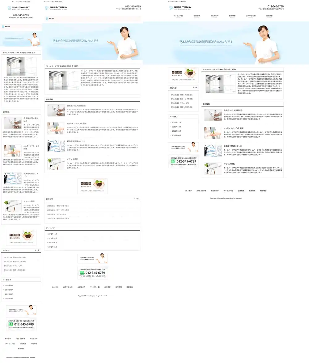 企業サイト(会社概要・コーポレーションサイト・企業案内)や医療サイト(病院・歯医者・歯科医院・整体)に最適なホームページデザインです。