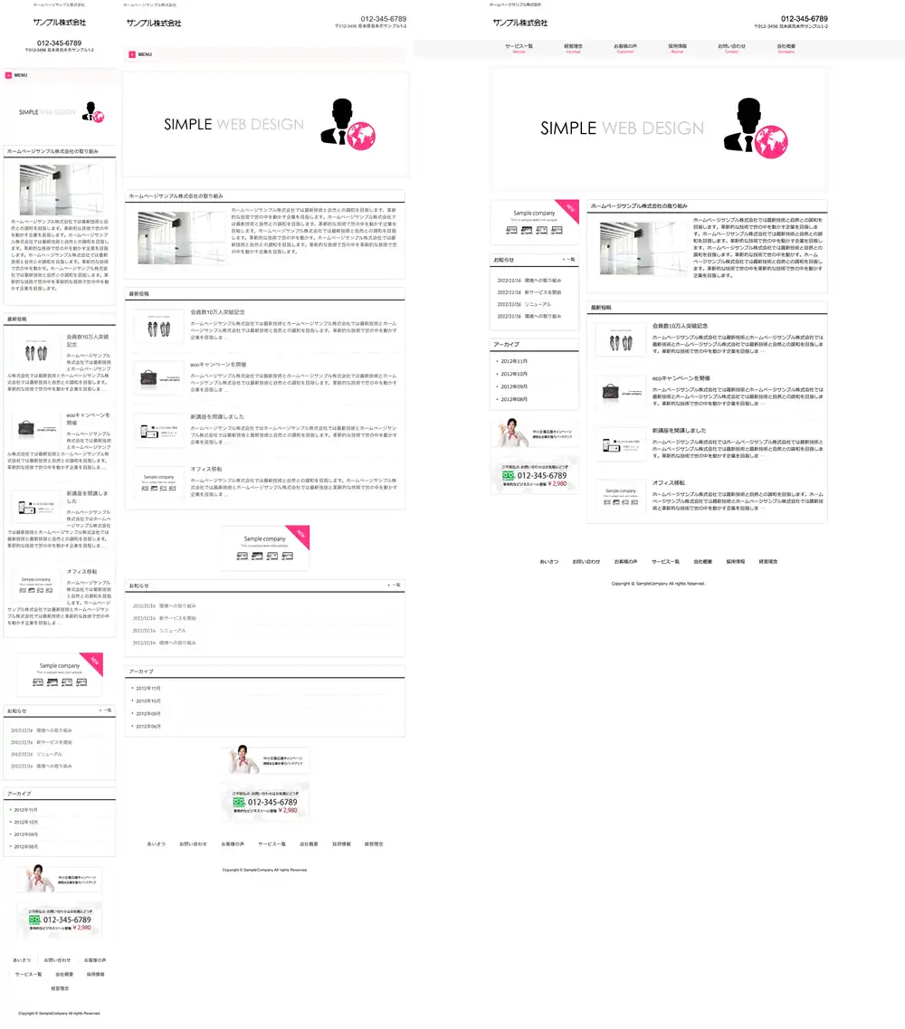・クリックで拡大表示できます。・左からスマートフォン、タブレット、パソコンでの表示イメージになっています。
