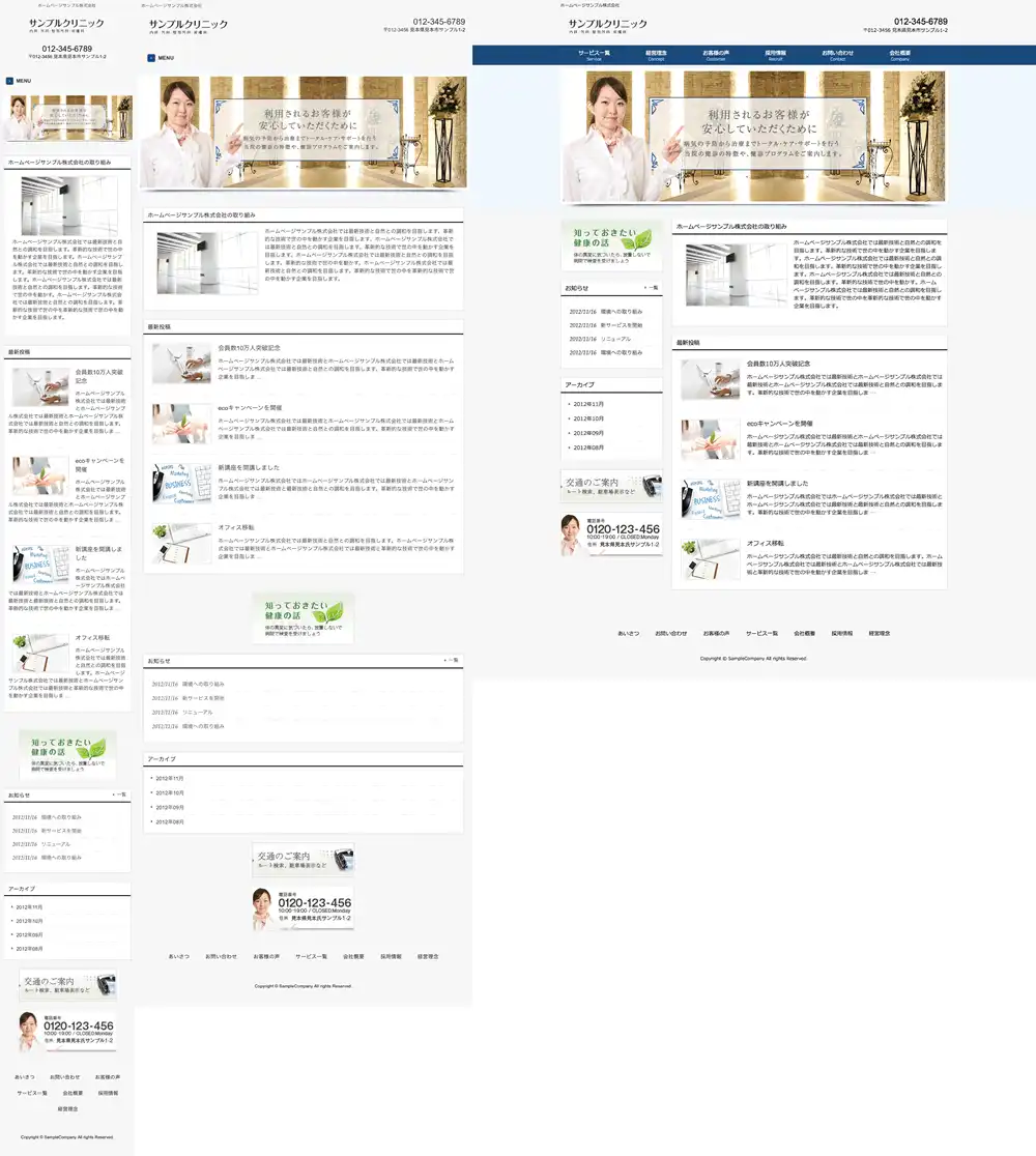 ・クリックで拡大表示できます。・左からスマートフォン、タブレット、パソコンでの表示イメージになっています。