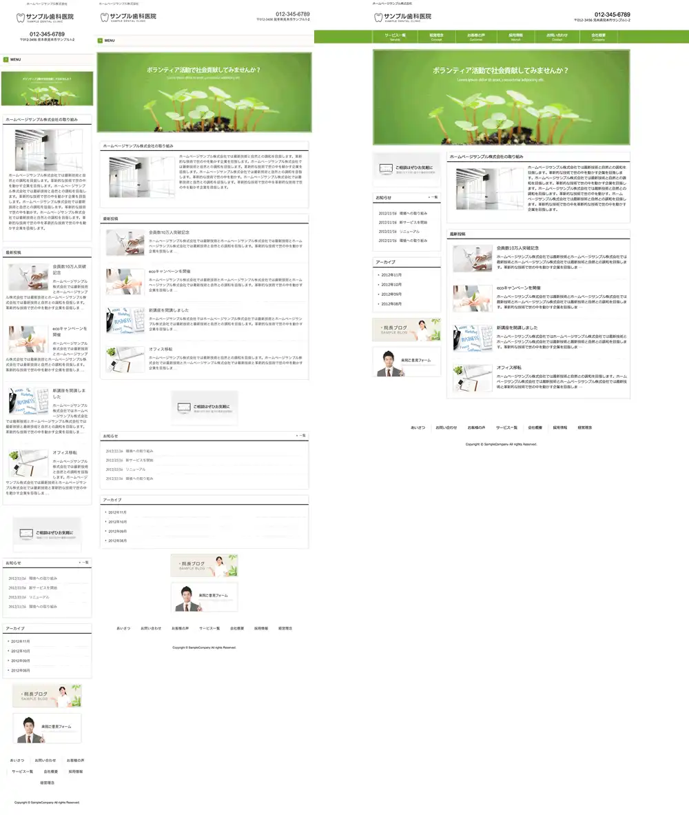 ・クリックで拡大表示できます。・左からスマートフォン、タブレット、パソコンでの表示イメージになっています。