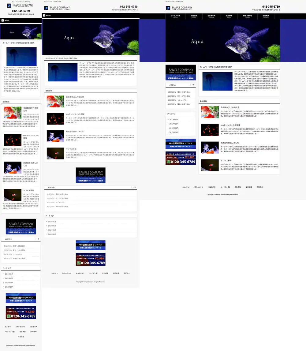 熱帯魚ショップ、スキューバダイビング、マリンスポーツなどのイメージに最適なホームページデザインです。